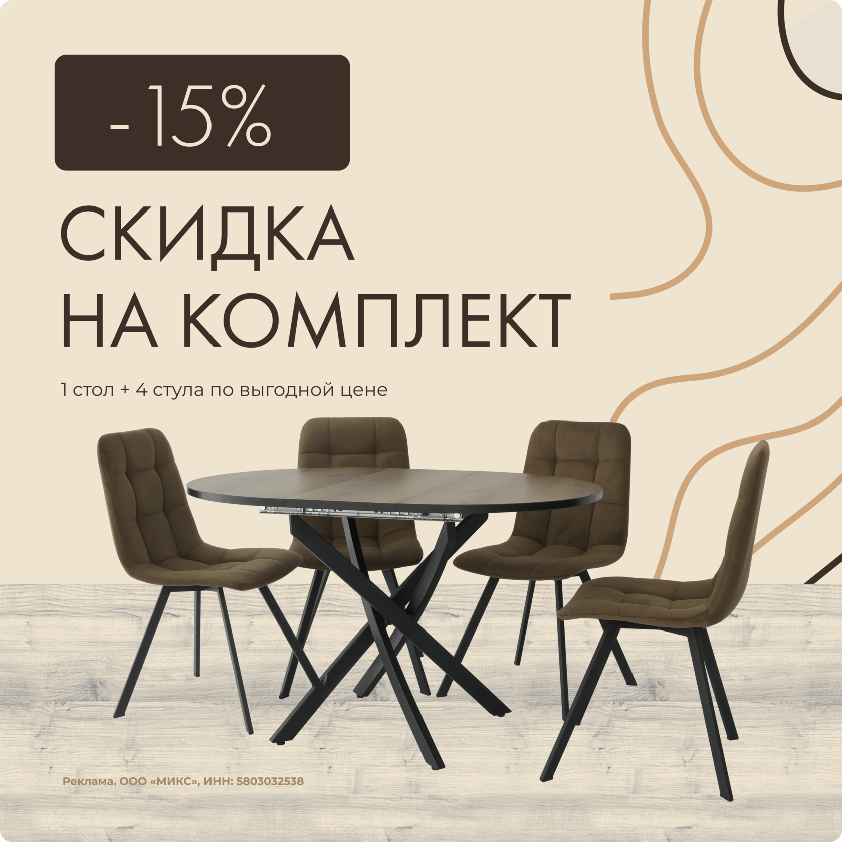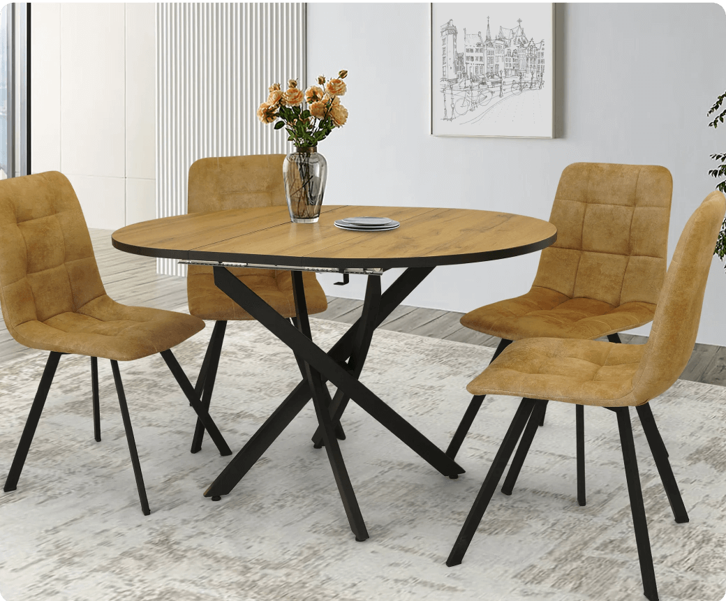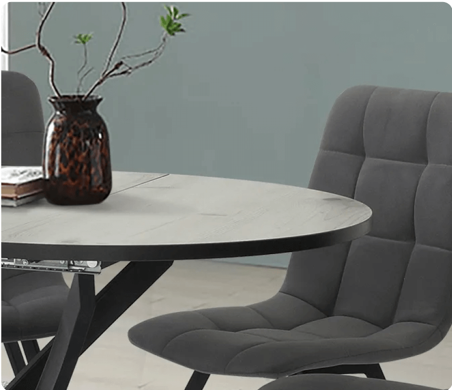 Описание Отличное решение для встречи всей семьёй за обедом в комфортных условиях. Современный дизайн и качественные материалы, из которых изготовлены стол и стулья, отлично подойдут к любому интерьеру. Форма ножек стола и их крепления гарантирует хорошую устойчивость. Мы позаботились о напольном покрытии и предусмотрели подпятники на ножках стола и стульев. В отличие от других моделей, круглый столик устойчиво стоит на любой поверхности. Профессиональная покраска металлических ножек — настоящее спасение для хозяев с домашними питомцами. Подстолье выдерживает высокую нагрузку при ежедневной постоянной эксплуатации, а также на крупные праздничные застолья. Конструкция круглого раздвижного стола позволяет увеличить первоначальный размер (90*90) на 30 см. до 120*90 см, что позволит комфортно разместить до 8 человек. Ножки стульев изготовлены из металла и способны выдержать вес до 150 кг. Стулья просты в уходе. Наша компания использует ткани премиум качества, у которых бархатная текстура под вельвет или бархат с высокой устойчивостью к истиранию, загрязнениям, легко чистятся, с защитой антикоготь.
